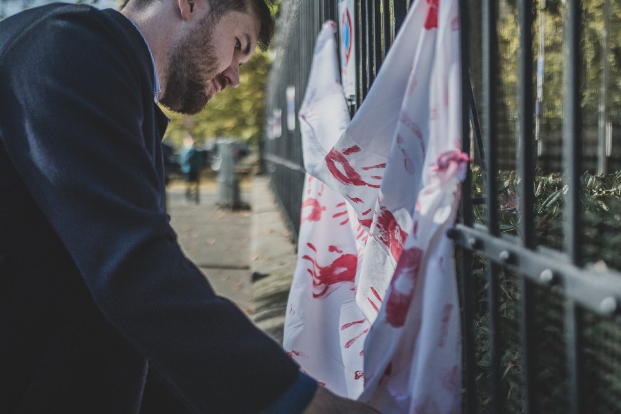 Október 23-án vasárnap egy véres kezeket szimbolizáló fehér vásznat akasztottunk ki az orosz nagykövetség kerítésére, egyrészt az 56-os orosz invázióra emlékezve, másrészt tiltakozva Ukrajna inváziója ellen.