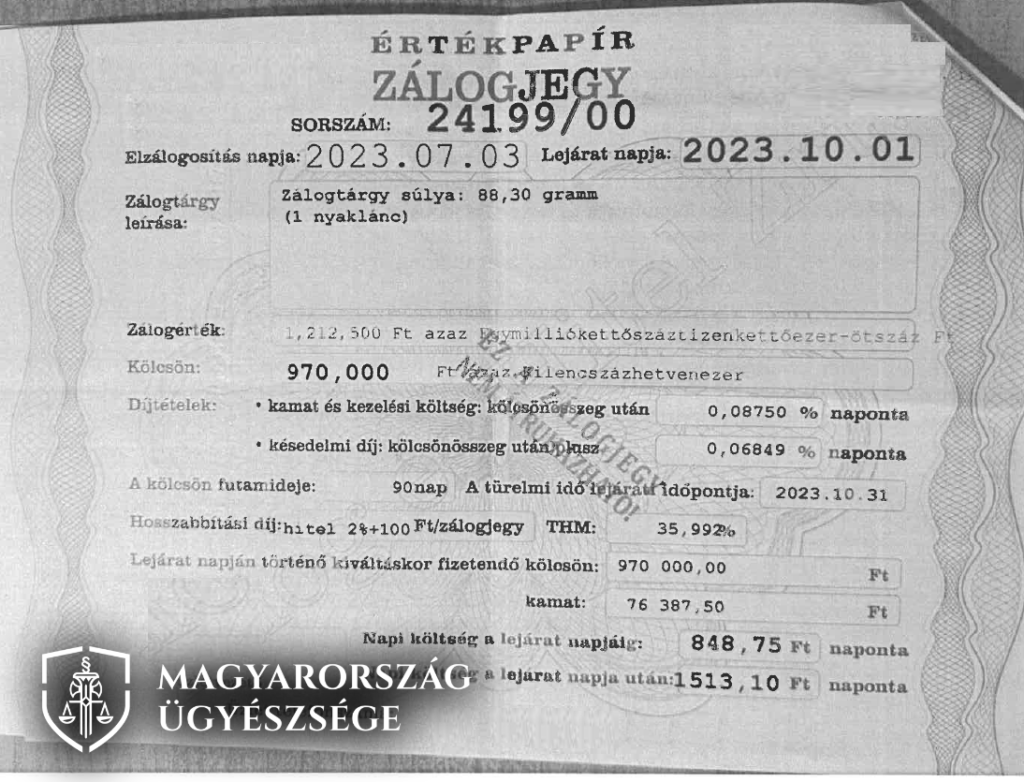 A csatolt fotón a sértett arany nyakláncának zálogba adásáról készült zálogjegy látható.