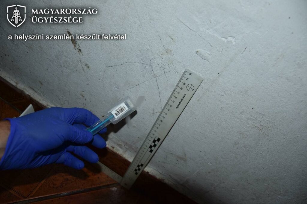 A rendőrségi fotón az elkövetés helyszínén történő nyomrögzítés látható.