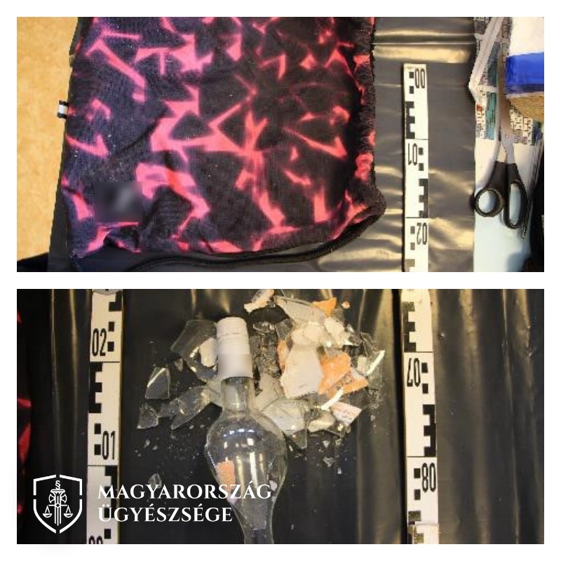 A fénykép a bántalmazáshoz használt hátizsákról és benne lévő összetörött borosüvegről készült.